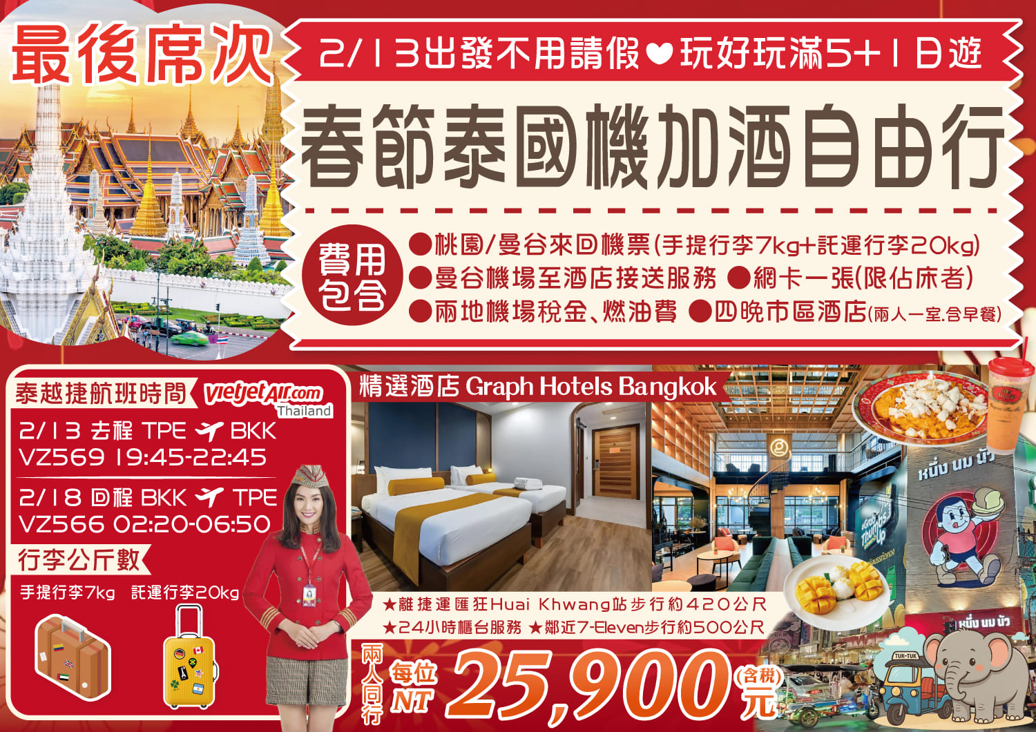 春節泰國機加酒自由行5+1日遊