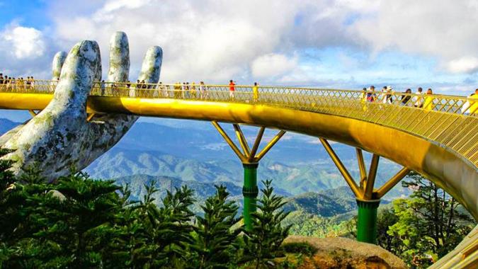 斥資20億美金打造的巴拿山《黃金佛手橋》,從海拔近1,500公尺的山壁伸出一雙古代巨手,還特別刻出巨手上的裂痕與青苔,超有歷史感!由於巴拿山地理位置高,沒有雲霧時可以眺望到峴港的海灣、雲霧來時,《黃金佛手橋》若隱若現,有種漫步雲端上的錯覺。
