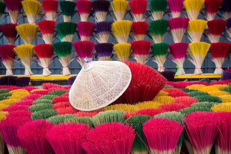 順化百年工藝製香村是一個充滿歷史與人情味的地方,至今仍傳承著古老的手工製香技藝。村中隨處可見整齊排列、色彩繽紛的香枝,如花束般點綴著小巷,為古村增添獨特風采。製香師傅們依循祖傳手法,將天然藥材與香料細心調配,再經過搓揉與晾曬,散發出淡雅悠長的香氣。遊客來此,不僅能欣賞繽紛景致,感受這份代代相傳的工藝精神,深入了解順化文化的溫潤與底蘊。