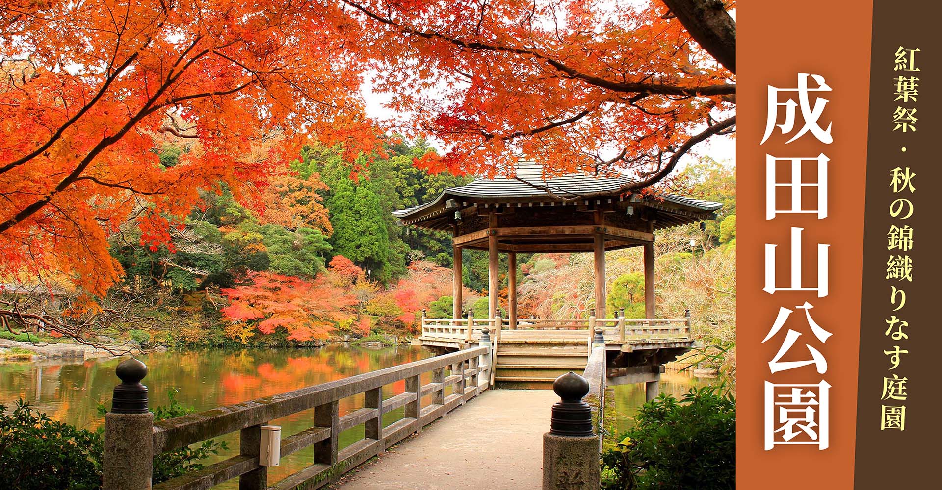 成田山公園坐落在成田山新勝寺大本堂後方,擁有東京巨蛋3.5倍大的廣闊面積。這是一個與大自然融合的日本庭園,園區內楓樹、銀杏樹等色彩的交疊,特別是紅葉映照在池塘水面上的畫面,創造出宛如浮世繪的風景。毎年的11月中旬到下旬是最佳賞楓時間,同時也會舉辦「成田山公園紅葉祭」。
