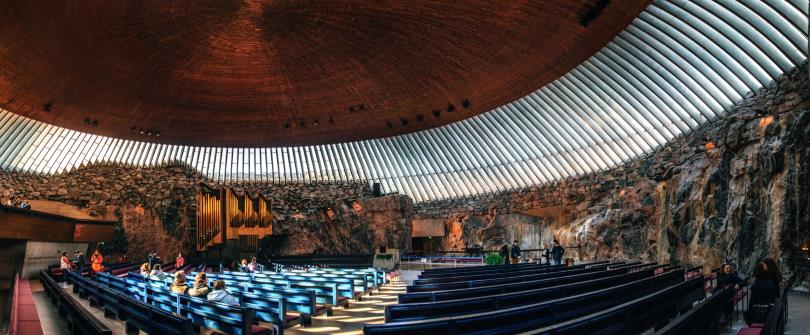 天然岩壁與銅製圓頂相互融合,營造出莊嚴又充滿靈性的氛圍。自然光透過圓頂周圍的玻璃灑入,營造神聖寧靜的空間感。優異的聲學設計成為音樂會的熱門場所。這座建築完美融合自然、建築與信仰,展現出芬蘭簡約而深沉的美學風格。
