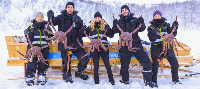 挪威、芬蘭和俄羅斯三國交界處,特別安排帝王蟹捕捞之旅。我們將搭乘雪上摩托車拉動的雪橇行駛在結冰的峽灣之上,並由專人為您解說示範當地捕撈自巴倫支海、體型巨大、肉質鮮甜帝王蟹,體驗當地人在冬季的「捕撈帝王蟹」技法。