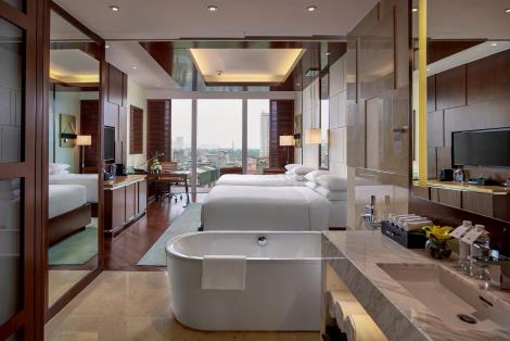 《JW萬豪酒店》擁有450間客房,其最小客房面積近15坪起跳,與河內其他五星飯店比較,空間相對寬敞舒適,現代設計加上硬木、暖色系的搭配,舒適宜人!且衛浴區配有高級獨立浴缸,可以在旅途後泡澡,輕鬆享有河內市區景觀。