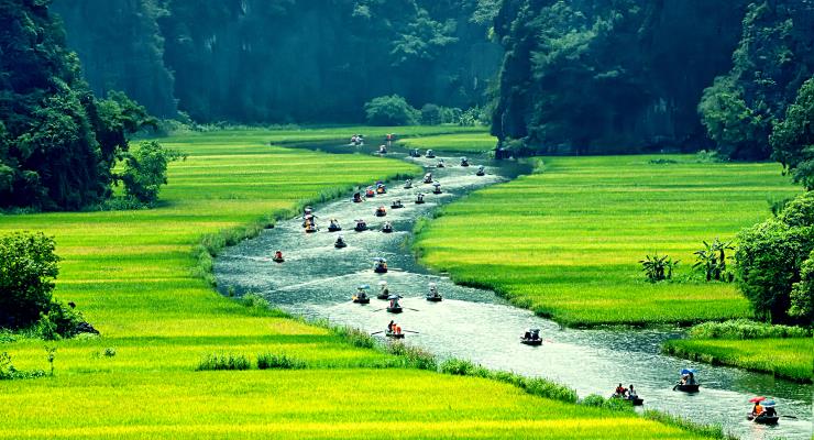 素有「陸上下龍灣」之稱的陸龍灣與下龍灣同樣為石灰岩地形,擁有群山環繞、生態田園風光、寧靜鄉村景色,另外還有生生不息河水蜿蜒其中,如此的良地在越南10~11世紀時都曾定都在此。