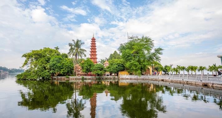 西湖為河內市境內最大湖泊,湖泊面積達五方公里,鎮國寺是河內的西湖最漂亮的古建築。這裏景色秀麗、環境清雅、古色古香。越南各朝代一直將它用作行宮。寺的四周用圍牆圍起,寺廟的周邊種滿了荷花,荷花季節,煞是好看。