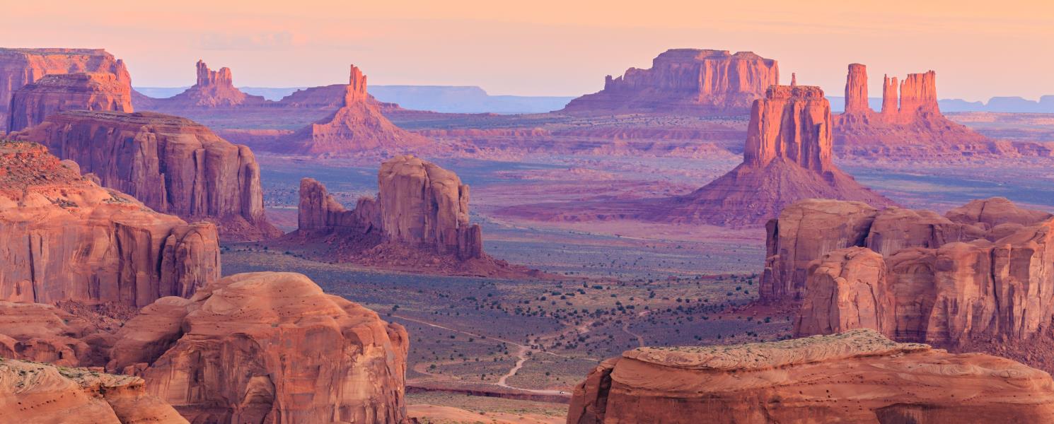 紀念碑山谷,位於位於科羅拉多高原,橫跨美國亞利桑那州與猶他州交界處,獨特的景象經常出現在美國電影中,可說是最能展現美國西部風味的地方了。藍色的天空為背景,幾座突出的紅色岩石山,聳立在火紅色的遼闊大地上,有如宏偉的紀念碑一樣,十分壯觀。