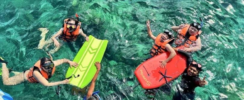 讓您盡情暢玩海上活動!搭乘能容納60人的超大豪華遊船,享受豐富多元的體驗:浮潛探索海底世界,挑戰3.5米高空跳水、刺激水上闖關,以及高速滑道溜滑梯。還有多人陀螺、SUP立槳、網美水晶玻璃底船、人魚裝扮、海上吊床、親子泳圈等拍照打卡必備項目!更貼心提供無限暢飲飲料、精緻小點、HI-FI音響,孩子們還能安全玩耍。