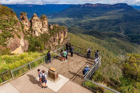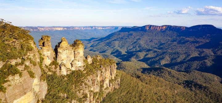 藍山國家公園以廣闊的尤加利樹林聞名,陽光折射樹油產生的藍色薄霧令人陶醉。這裡有壯麗的三姊妹岩地標,可搭乘全球最陡火車深入雨林,或在透明纜車俯瞰傑米遜谷。奇岩、瀑布與古老溶洞,共同織就這片世界遺產的壯闊神韻。