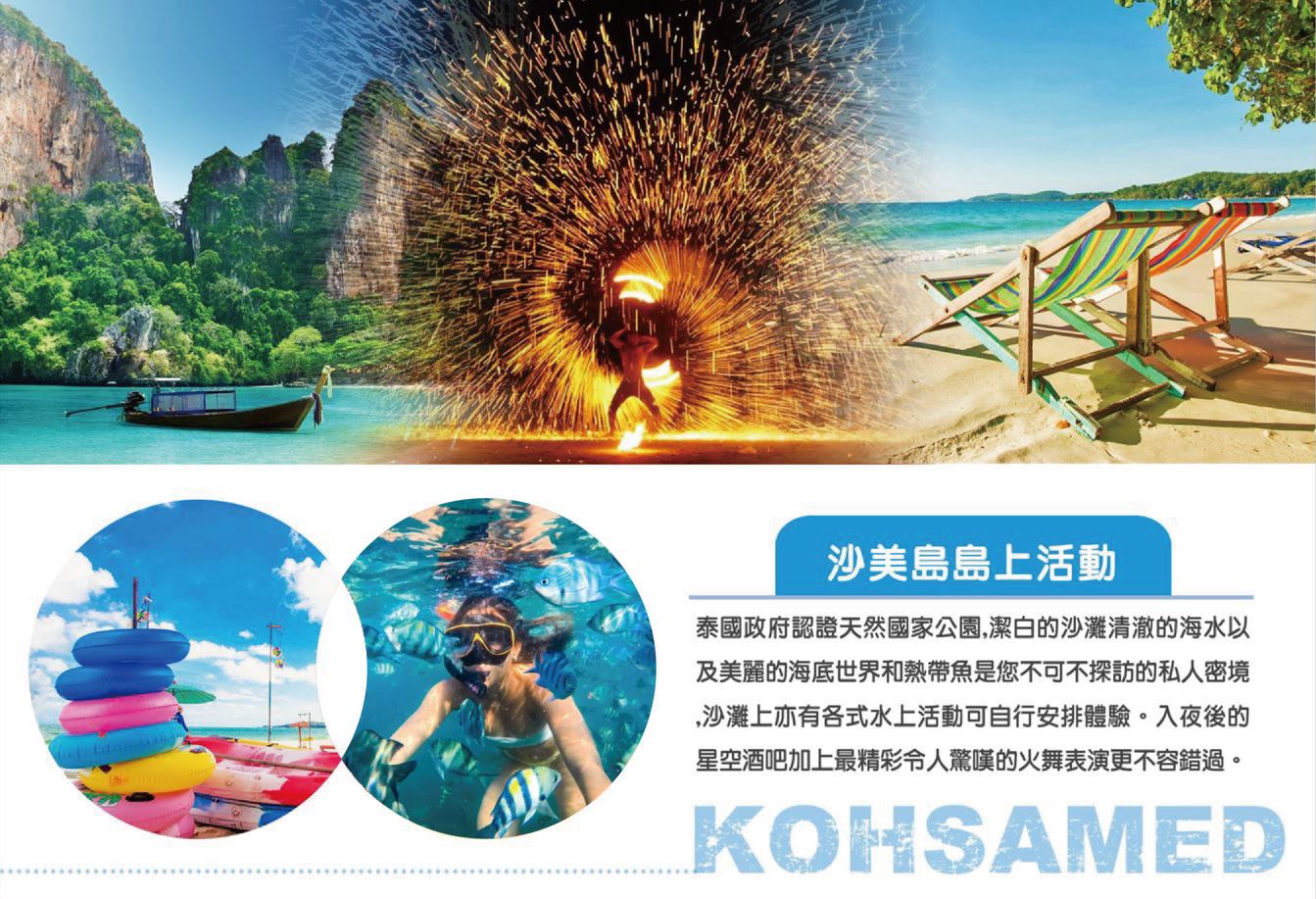 安排搭乘快艇出海,前往沙美島國家公園(約20分鐘)。快艇飛馳於碧海藍天,後抵達沙美島國家公園風景區。位於泰國灣上的一個小島,靠近曼谷東南面大約220公里,行政屬於泰國羅勇府。以其美麗的沙灘和全年豐富的海上活動,吸引著來自世界各地的遊客。沙美島的名字是得自於生長在島上地一種月桂樹,在泰國稱之為“沙美”。島上是國家自然公園,島東岸多個自然沙灘,而西岸則以日落出名。對於居住在曼谷的泰國人和外國人來說,沙美是個受歡迎的週末逃遁之地。
