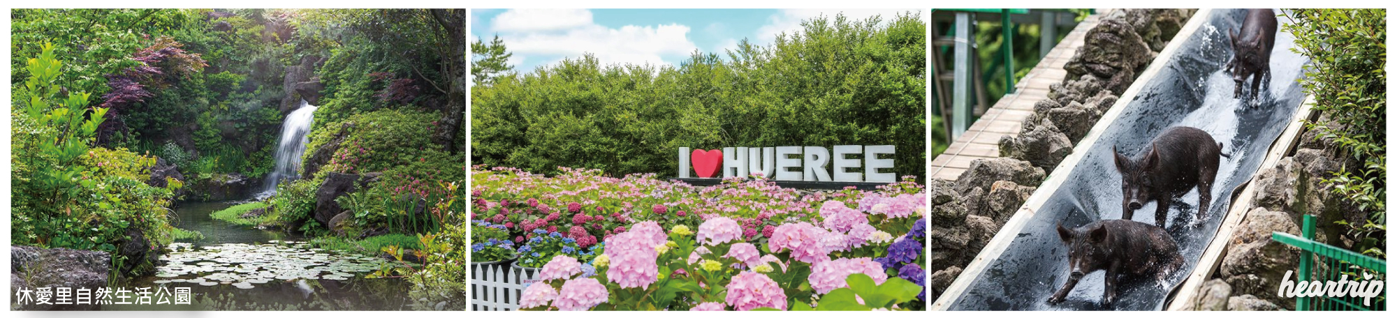 【休愛里自然生活公園】位於漢拏山山麓充滿濟州風情的休愛里自然生活庭園,堪稱「濟州島中的小濟州」,在此能多方面感受濟州文化。園中會視季節氣候狀況舉行如梅花節、繡球花節等慶典,另外園內還有濟州黑豬溜滑梯表演、騎馬、餵食濟州家畜、堆石塔等各種有趣的體驗活動,以及能觀察蝴蝶與各色昆蟲的主題體驗館,更能在偶來小徑中漫步忘卻都市喧囂、呼吸新鮮自然的空氣。