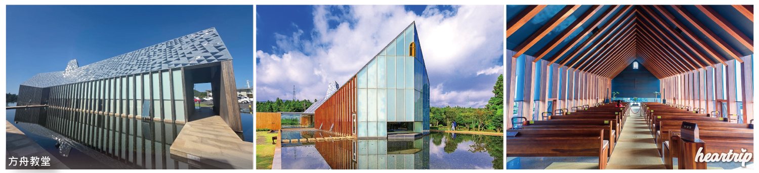 【方舟教堂】由知名建築師伊丹潤所設計的【方舟教堂】,是以諾亞方舟做為概念。教堂的四周被水池圍著,就像是一艘方舟浮在水面上。