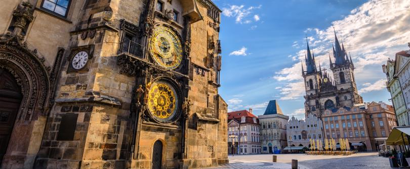 鐘樓建於1410年。根據當年的地球中心說原理設計,上面的鐘一年繞一周,下面的一天繞行一圈,每天中午12點,十二尊耶穌門徒從鐘旁依次現身,6個向左轉,6個向右轉,隨著雄雞的一聲鳴叫,窗子關閉,報時鐘聲響起。