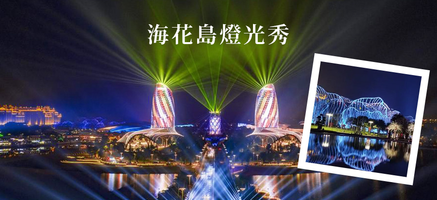 【海花島國際燈光秀(下車參觀)】點亮世界的璀璨聯袂國際舞美燈光設計大師沙曉嵐,運用新理念與科技,傾力打造全球為之震撼的海島光影盛宴——“奇蹟海花如夢之旅”燈光秀,夜幕下,璀璨奪目的燈光秀璀璨綻放,點亮海花島不夜城壓軸大秀,深受廣大遊客喜愛。