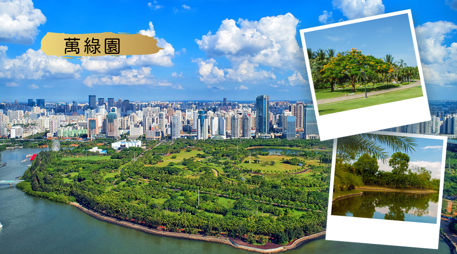 【萬綠園(入內參觀)】萬綠園獨具熱帶海濱特色及生態風景園林特色,將藍天、綠水、原野、現代化高樓融為一體,以海南熱帶觀賞植物為主,也種植國內外熱帶、亞熱帶觀賞植物,充分體現熱帶風光、海濱特色、國際性旅遊景點的特色。徜徉於萬綠園中,藍天白雲,綠草茵茵,碧海波光粼粼,讓遊人在都市喧囂之中享受一隅寂靜,體會人與自然和諧交融的美好情趣,從而擁有美好的心情。